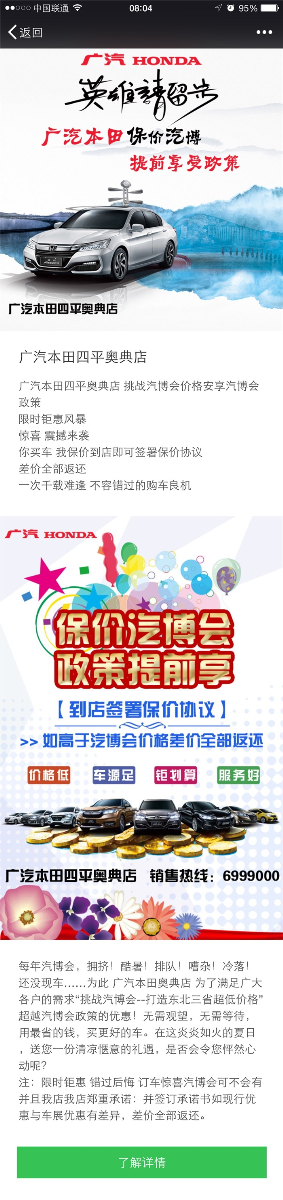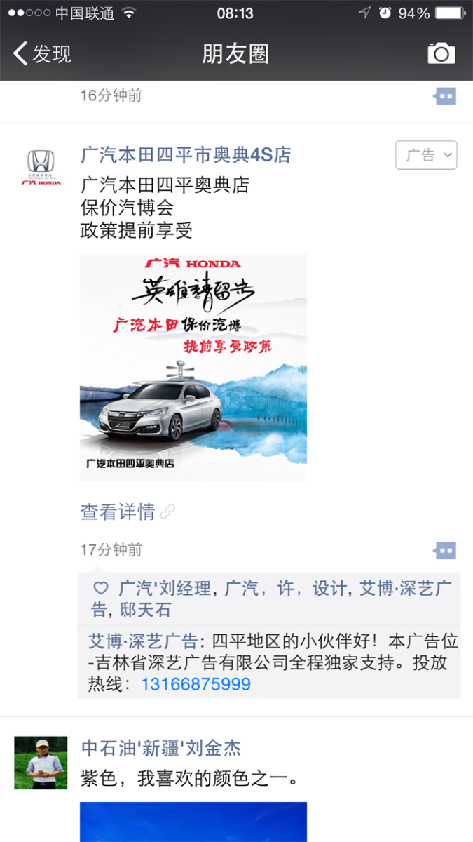 恭喜四平廣汽本田奧典店微信朋友圈廣告上刊成(chéng)功!