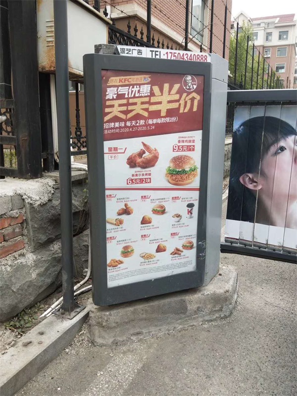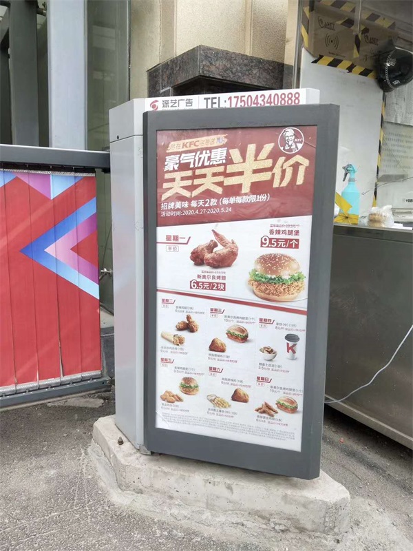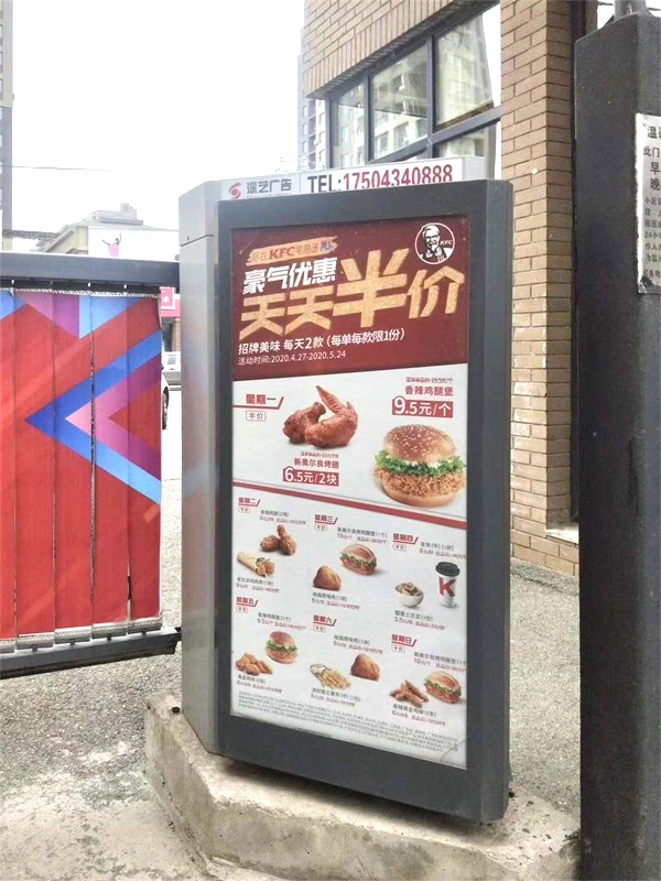 恭喜肯德基道(dào)閘燈箱廣告位上刊成(chéng)功!豪氣優惠、天天半價、盡在KFC宅急送、招牌美食每天2款(每單每款限1份)活動時(shí)間:2020.4.27-2020.5.24。